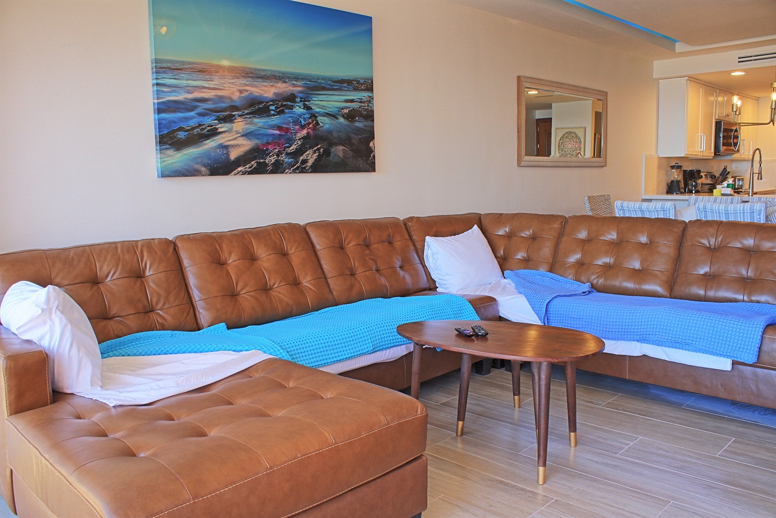 Sleeping arrangements are 4 king beds and then sheets and a blanket for 2 people on the sectional sofa. The sheets can be found in a bucket next to the sectional sofa.